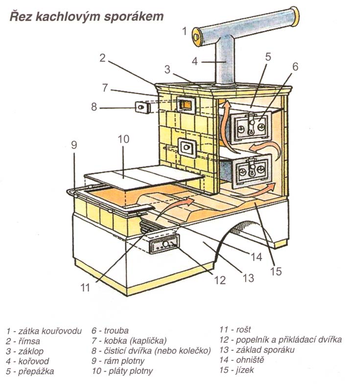 ![]() Řez kachlovými kamny s popisem jednotlivých částí |